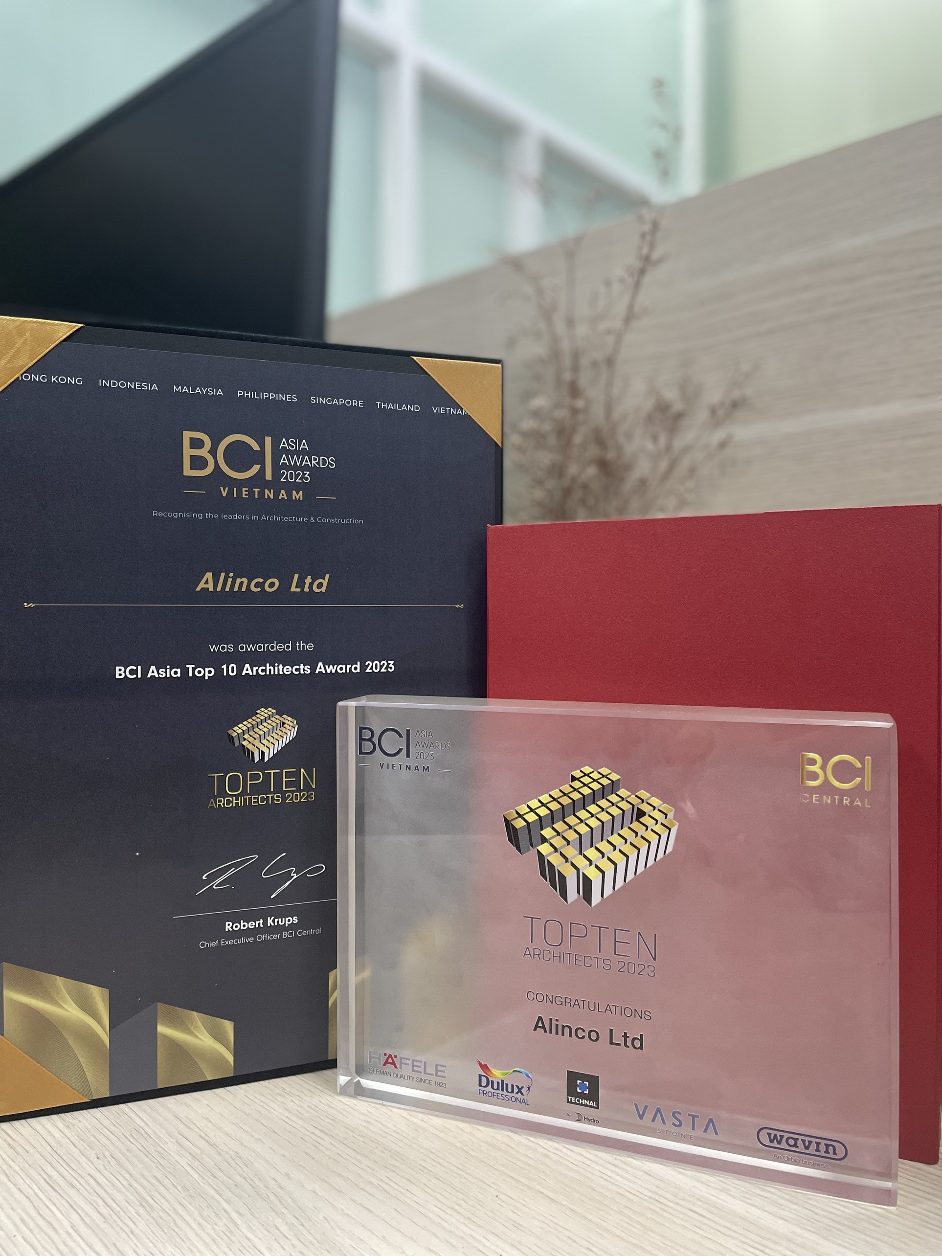 Alinco vinh dự khi 3 năm liên tiếp (2021, 2022, 2023) và cũng là lần thứ 8 đạt Top 10 công ty kiến trúc hàng đầu ở Việt Nam cùng với 9 công ty tư vấn: Baumschlager Eberle Architekten, Cubic Architects, GK Archi, HPA – BKV Design, HTT Group, Kume Design, NDA, NQH Architects, PTW Vietnam. Đây là một thành tựu đánh giá sự ổn định, bền vững trong lĩnh vực kiến trúc của Alinco ở bối cảnh khủng hoảng kinh tế toàn cầu, đặc biệt tại Việt Nam và trong ngành bất động sản.