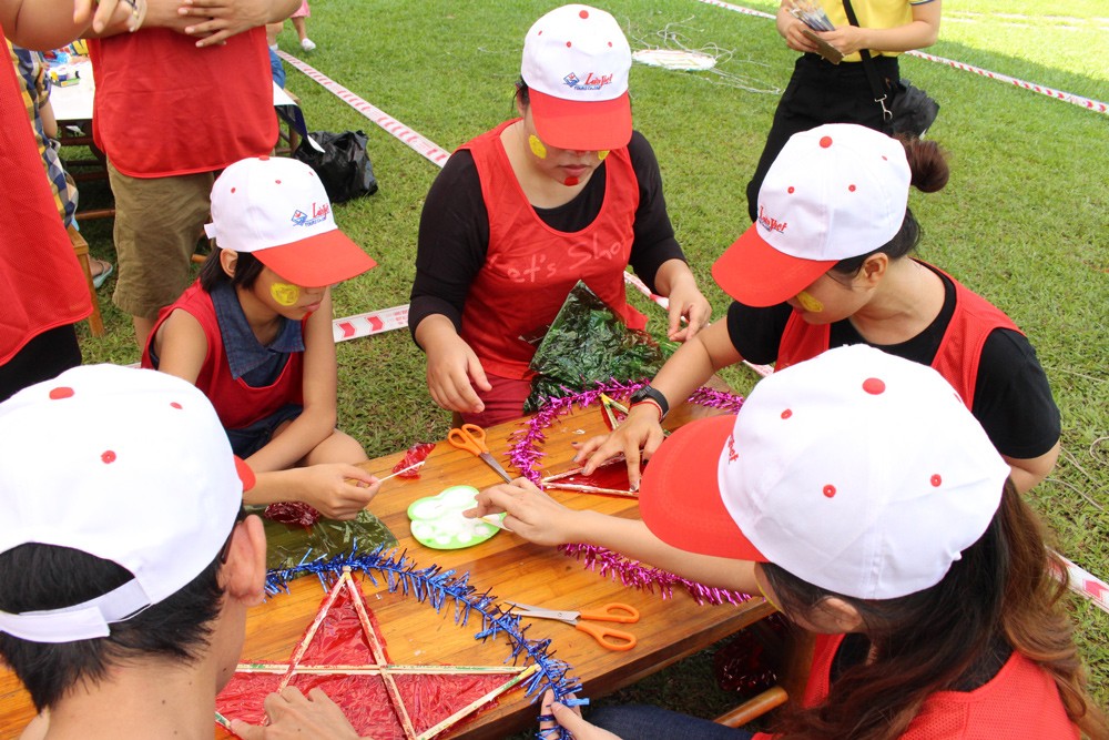 Là một chương trình Teambuilding nên các trò chơi là phần không thể thiếu, để khởi động nhẹ cho chương trình là trò chơi “Trang trí lòng đèn” cho các bé, nói là cho các bé nhưng các thành viên khác trong đội vẫn hỗ trợ hết mình. Những chiếc lòng đèn ông sao bé bé xinh xinh lần lượt được thành hình. Thật là một món quà không thể tuyệt hơn cho các bé dịp lễ trung thu này.